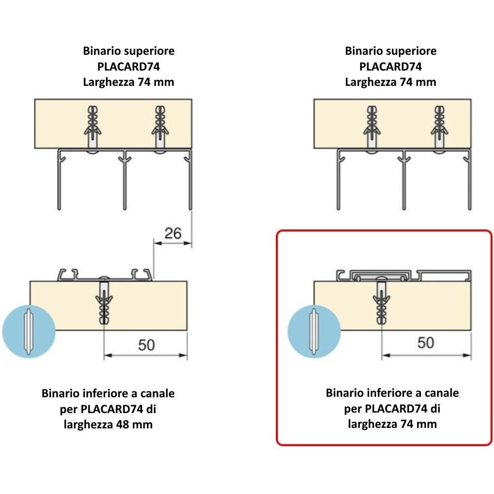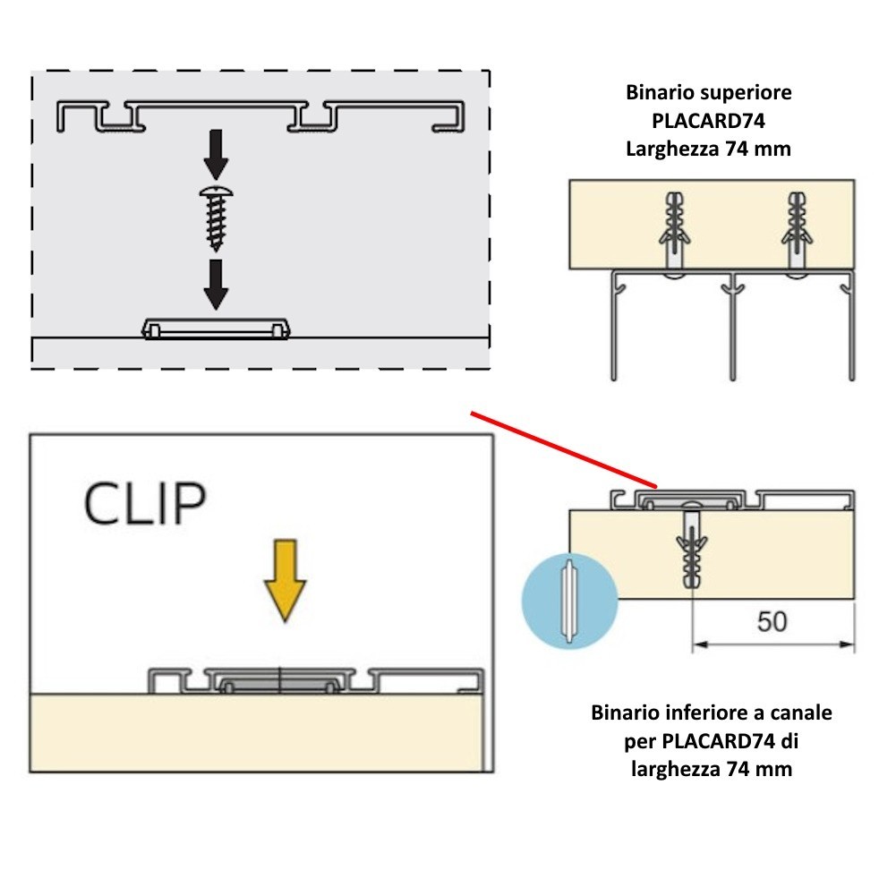 BINARIO INFERIORE A CANALE PLACARD74 DI LARGHEZZA 74mm LUNGHEZZA 3,90mt FISSAGGIO A CLIP NERO
