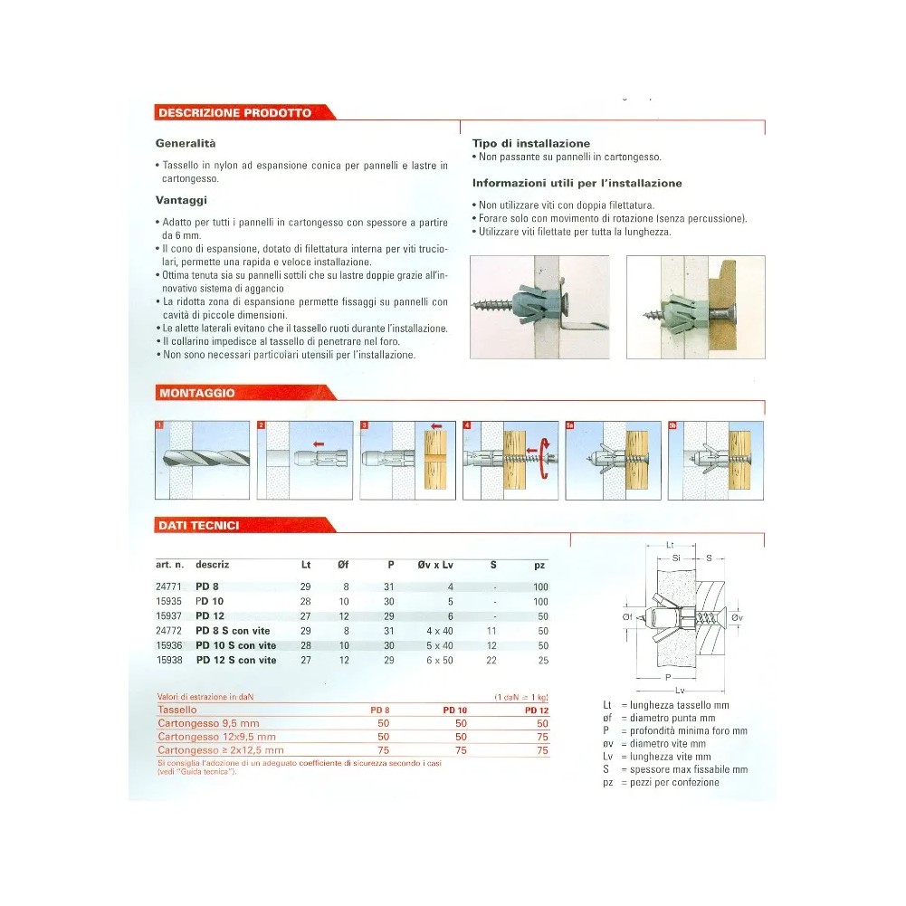 Blister di 5 tasselli PD d.8 mm in nylon per cartongesso, con vite in acciaio zincocromato ,impronta pozidrive.