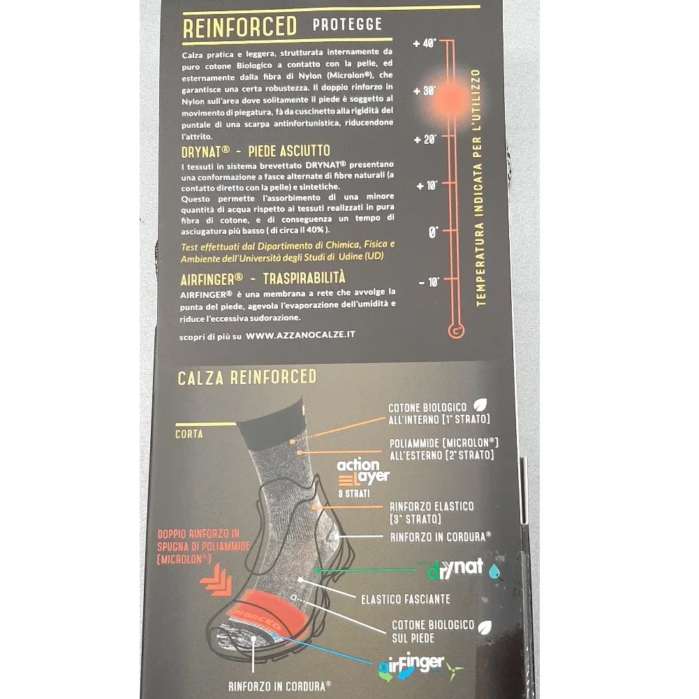 TECNOLOGIA ACTION LAYER MULTI STRATO:Sistema termoregolatore dell'interno calza che ritarda e attenua l'attivazione dei sensori della fatica, mediante i termorecettori della nostra pelle, che la comunicano al cervello.Il tubolare della calza internamente è ricoperto da un tessuto di pura fibra naturale molto sottile,(1° strato) mentre la parte esterna è interlacciata ad essa dal Microlon, fibra poliammidica leggerissima, che richiama l'umidità assorbita dal filato naturale che si trova a contatto con la pelle, disperdendola velocemente (2° strato).Il 3° strato è costituito dalle protezioni delle parti sollecitate.