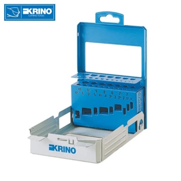 Scatola KRINO vuota portapunte per 19 punte HSS , da diametro 1 mm fino a diametro 10 mm , in lamiera con supporti interni ribaltabili.