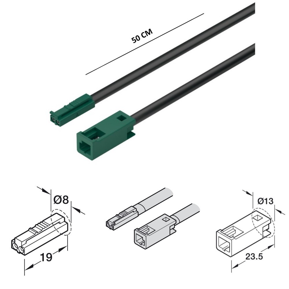 CAVO DI PROLUNGA HAFELE LOOX5 24V MONOCROMATICHE DA 500 MM. Lunghezza cavo: mt. 0,50 Capacità di carico corrente: max 5 A. Diametro foro passaggio presa 24V Loox5 (verde): 13 mm. Diametro foro passaggio spina 24V Loox5 (verde): 10 mm. CODICE HAFELE: 833.95.719