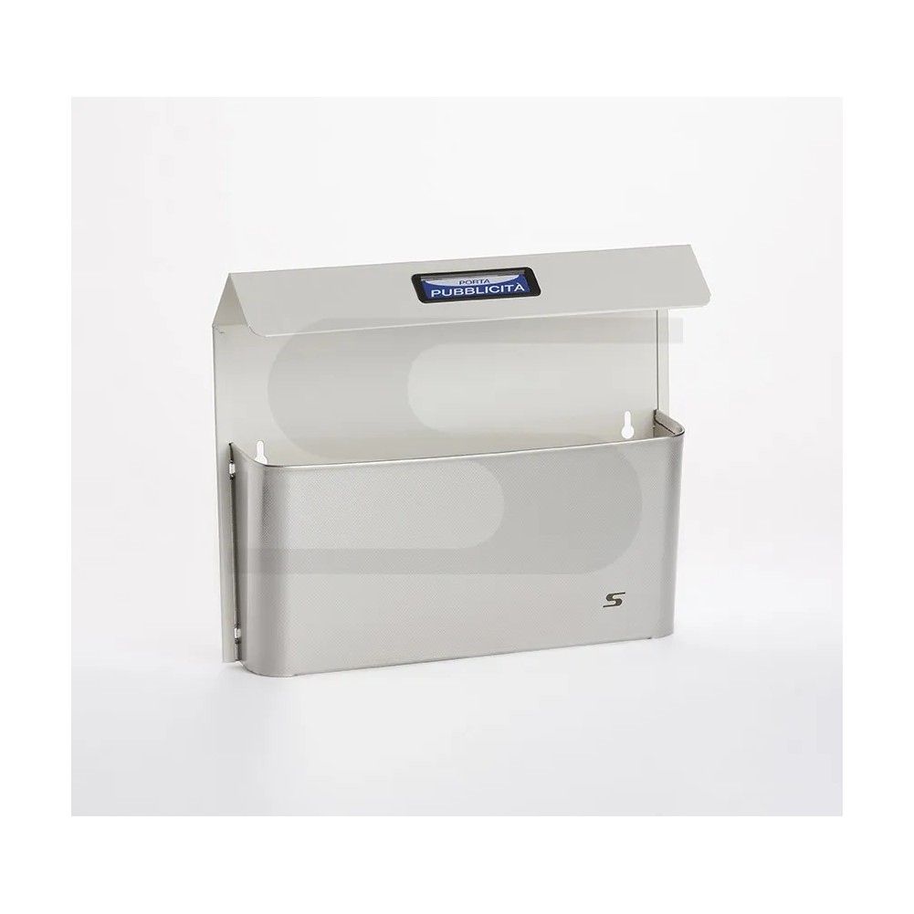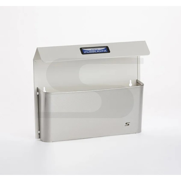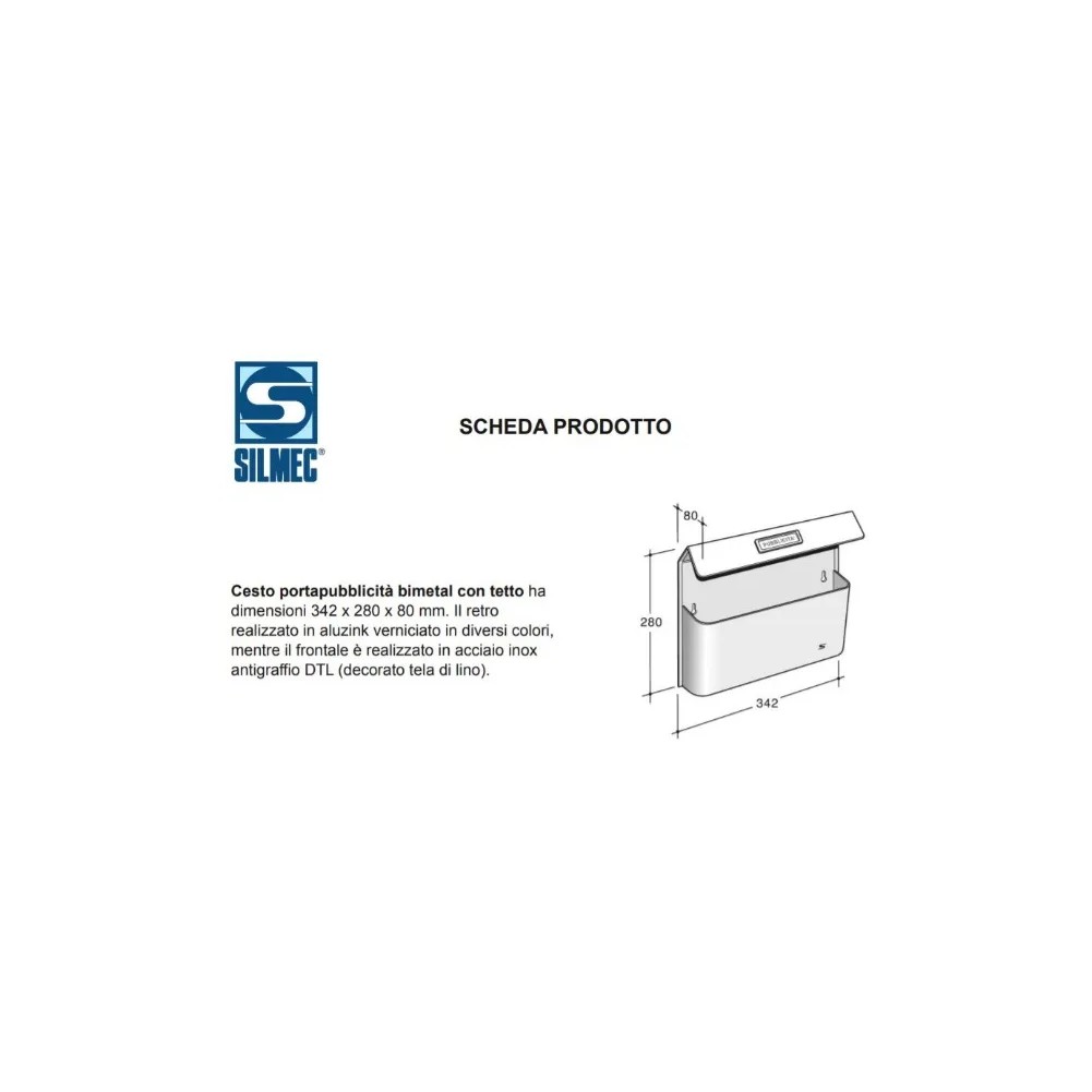 Cesto portapubblicita' con tetto,retro in lamiera di acciaio zincato e verniciato,frontale in lamiera di acciaio inox antigraffio (decorato tela di lino). Dimensioni l.372 h.320 p.120.