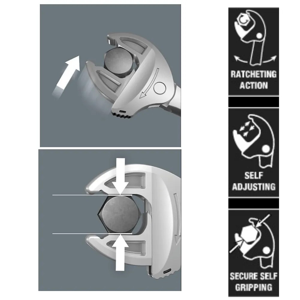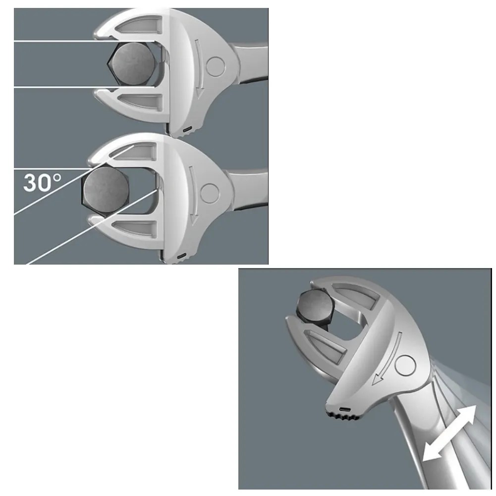 Il meccanismo a leva integrato serra la vite o il dado esagonale tra le ganasce, cosa che diminuisce di molto il rischio di scivolamento o di danneggiamento.
