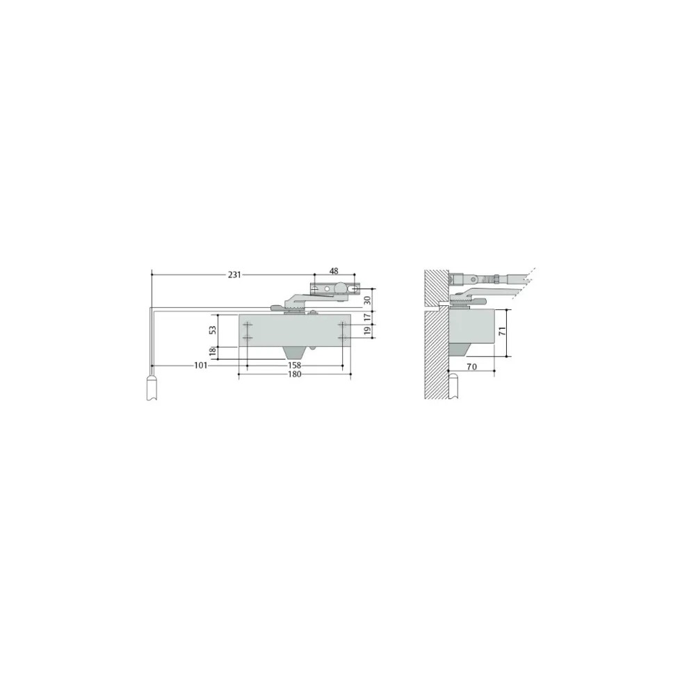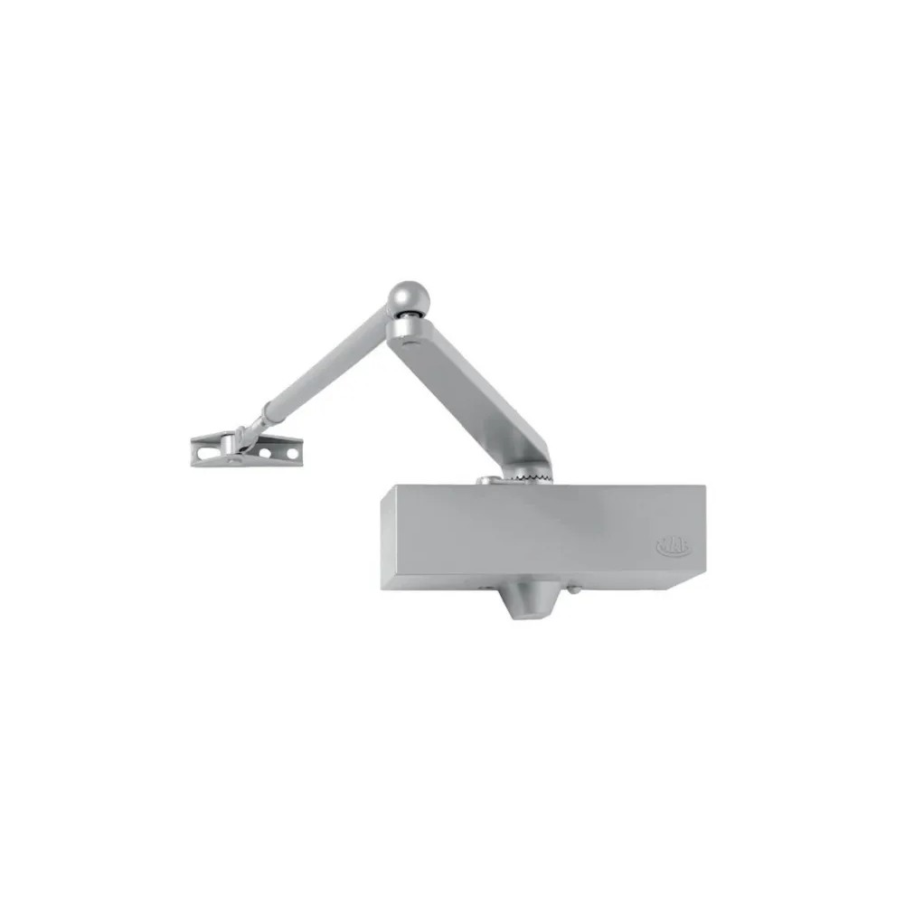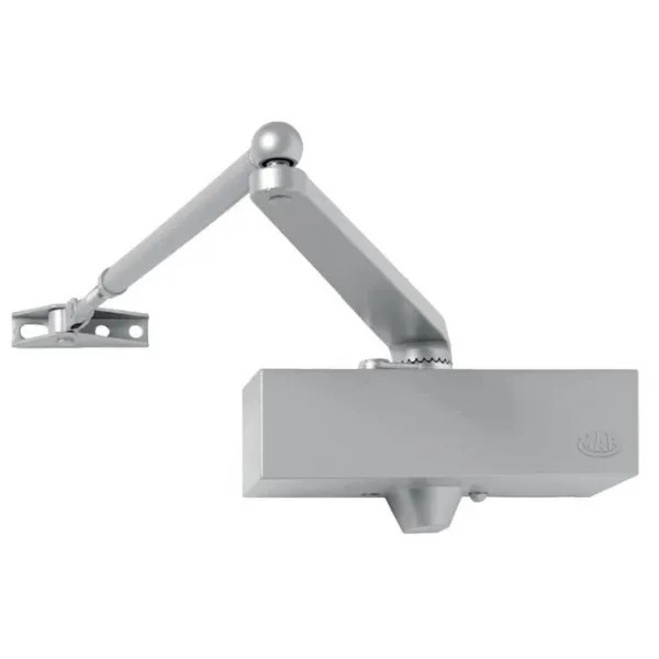 Chiudiporta aereo con meccanismo a pignone cremagliera e fermaporta integrato. Forza fissa di chiusura EN2 secondo la norma EN 1154. Per porte a battente fino a 850 mm. di larghezza. Corpo in ghisa. Custodia di finitura in abs ad alta resistenza. Modello a forza fissa EN2. Fermaporta integrato di facile e precisa regolazione, particolarmente indicato per porte esterne. Velocita' di chiusura 180' - 10' circa, regolabile con valvola termostatica non critica. In caso di regolazione senza scatto assicura un controllo su tutto l'arco di chiusura. Scatto finale da circa 10'. L'angolo di scatto e' facilmente modulabile da un braccio a doppio tenditore fino alla sua eliminazione completa: chiusura dolce. La possibilita' di scatto potente anche da angolo ridotto a pochi gradi, garantisce la chiusura anche in caso di serrature con scrocchi particolarmente duri. Finitura argento.