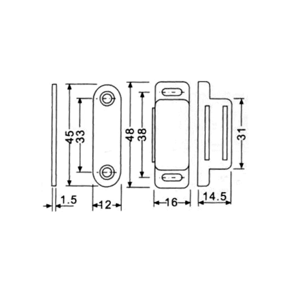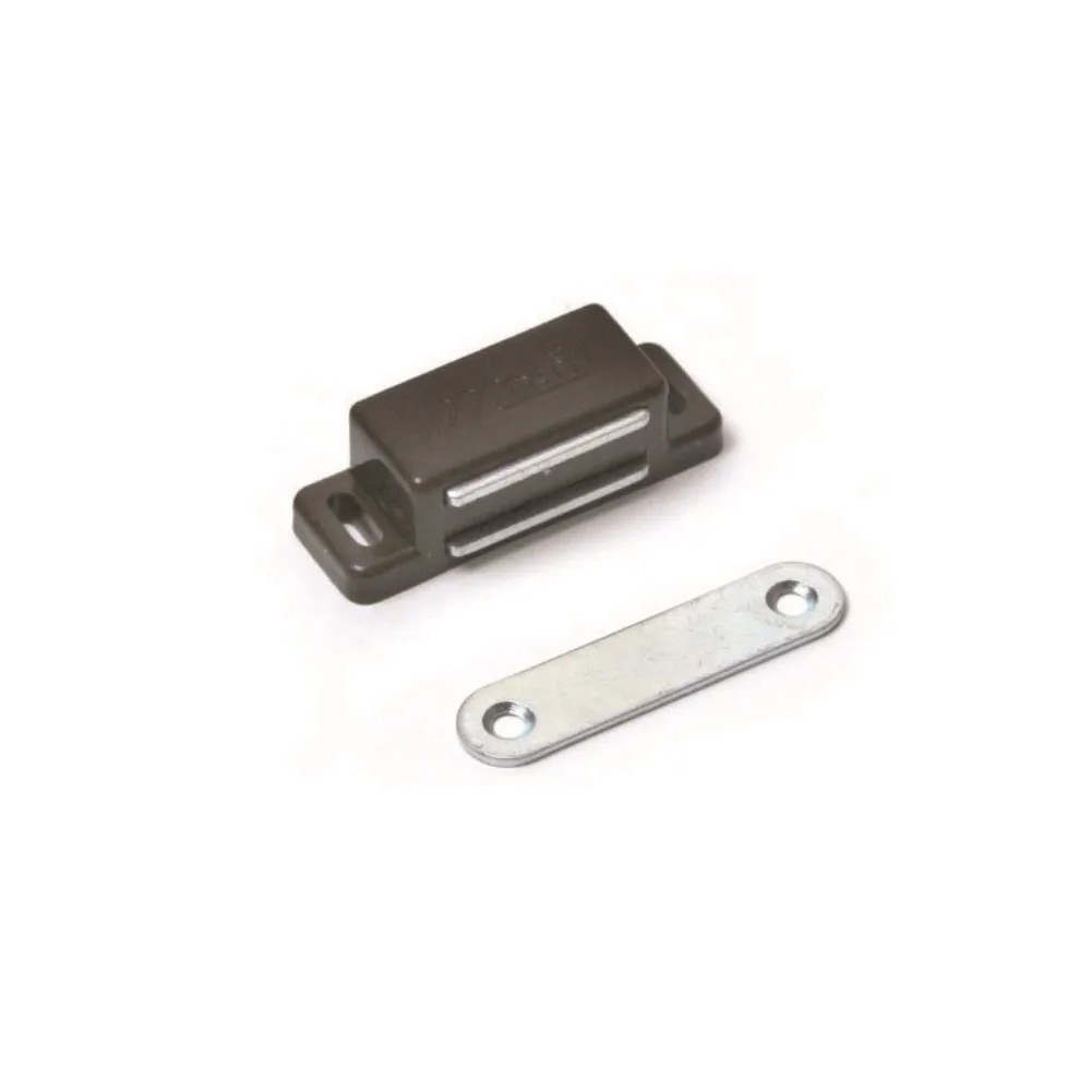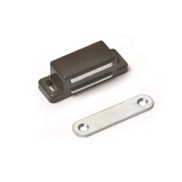 Chiusura magnetica per ante mobile. Portata kg.4. Dimensioni mm.45x16x14.5 mm. Finitura nylon marrone.