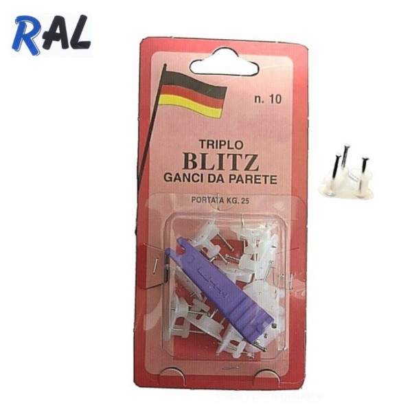 Confezione da 10 Ganci " BLITZ " da parete a 3 punte affilate in acciaio con base in nylon color bianco ; forniti con il loro speciale applicatore , utile per posizionare il gancio al muro senza rischiare di colpire le dita col martello .