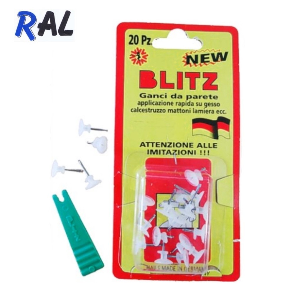 Confezione da 20 Ganci " BLITZ " ad 1 punta affilata in acciaio con base in nylon color trasparente ; forniti con il loro speciale applicatore , utile per posizionare il gancio al muro senza rischiare di colpire le dita col martello .