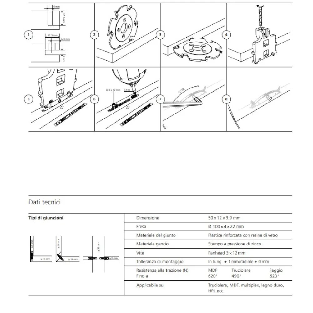 Clamex S-20 è una giunzione smontabile per il sistema Lamello, adatta su materiali con spessori a partire da 16 mm e che viene fissata nella scanalatura con apposite viti.