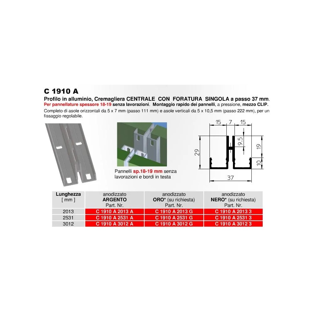 Cremagliera centrale con foratura singola in alluminio anodizzato argento a passo 37 mm.Per pannelli si spessore 18-19 mm.