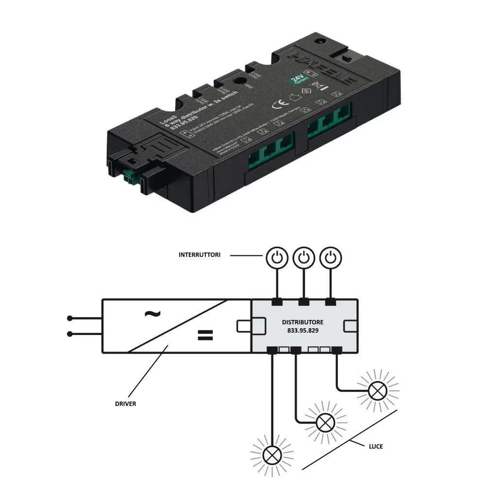 DISTRIBUTORE BOX A 6 VIE PER LED 24V HAFELE LOOX5 CON 3 INGRESSI PER SENSORI/INTERRUTTORI.