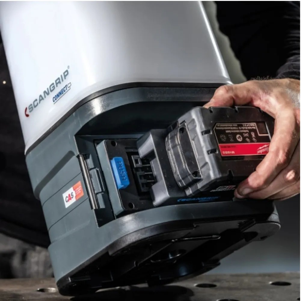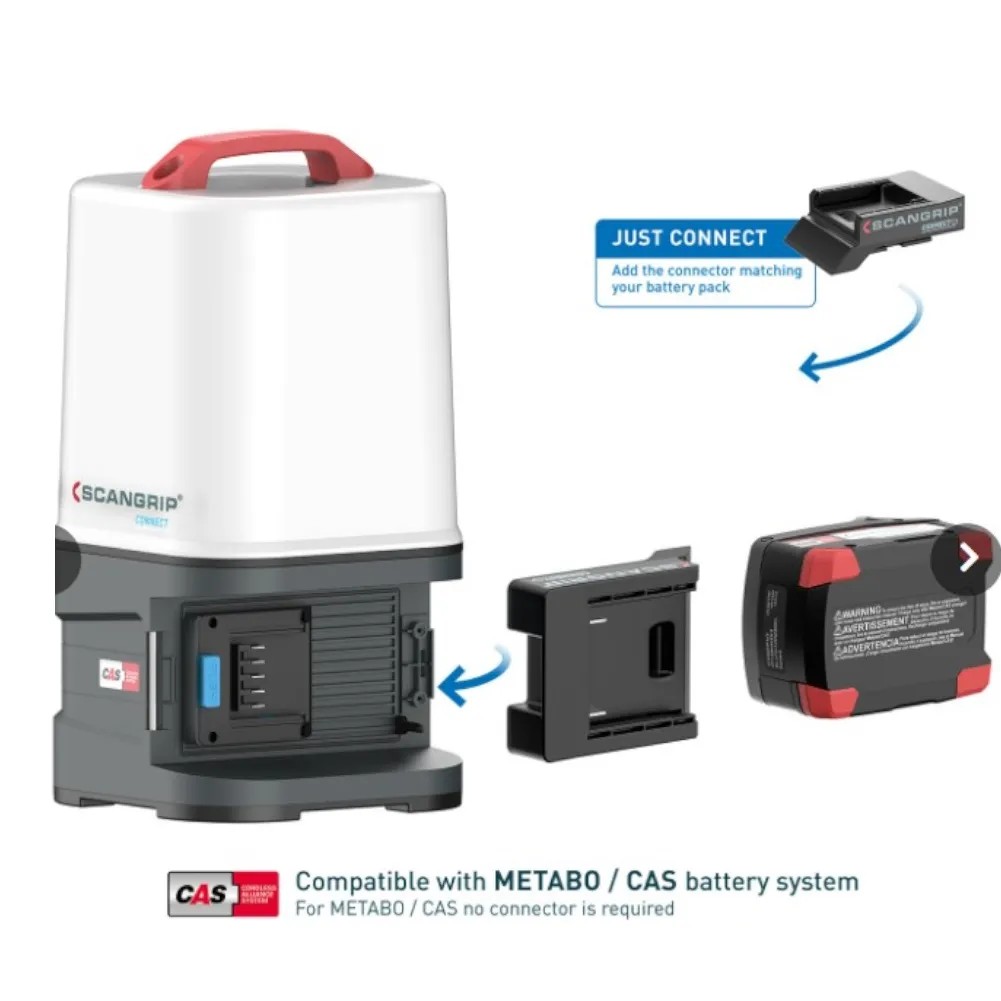 Come caratteristica unica, AREA 10 CONNECT è compatibile con il sistema di batterie METABO / CAS da 18 V e tutti gli altri pacchi batteria da 18 V/20 V delle principali marche di utensili elettrici utilizzando SCANGRIP CONNECTOR.