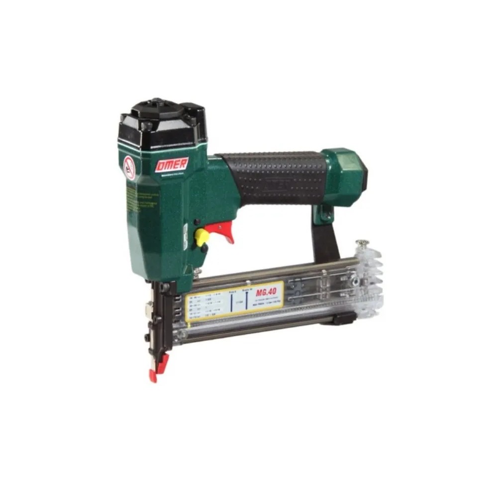 Fissatrice pneumatica OMER per groppini serie BRADS M da 20 a 40 mm. (sezione rettangolare 0,75X0,90) con testa mm.1.4. Utilizzi: modanatura su mobili e serramenti, lavori di decorazione, assemblaggi con legno tenero, mobili ingiunco, pannelli di tappezzeria e in legno, assemblaggio pannelli.