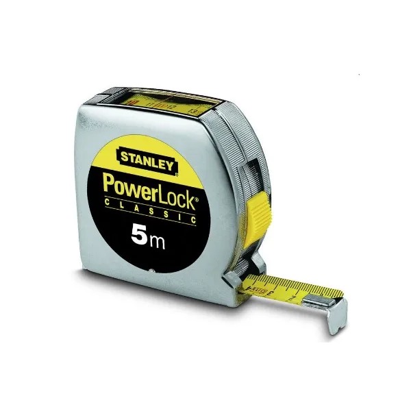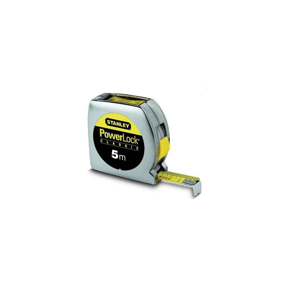 Flessometro Stanley modello Powerlock con cassa in materiale sintetico e nastro in acciaio al carbonio rivestito in Mylar. Lettura diretta sulla finestrella superiore. Lunghezza nastro mt.5, larghezza nastro mm.19. In Blister. PREZZO IN OFFERTA !!