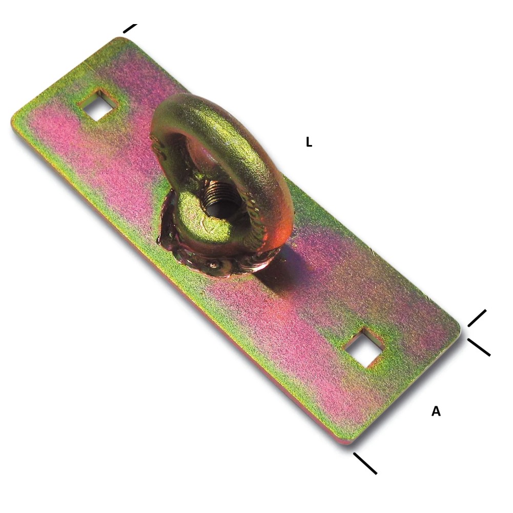 Golfaro di sicurezza saldato su piatra preforata in acciaio tropicalizzato. Misure piastra: A 60 mm. - L 180 mm. e spessore 5 mm. Misura interno anello: 35 mm.