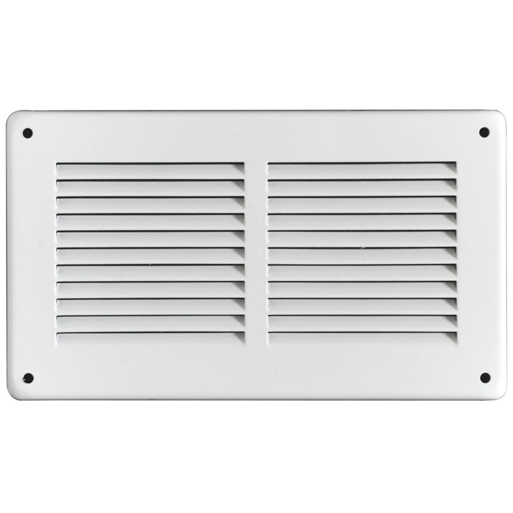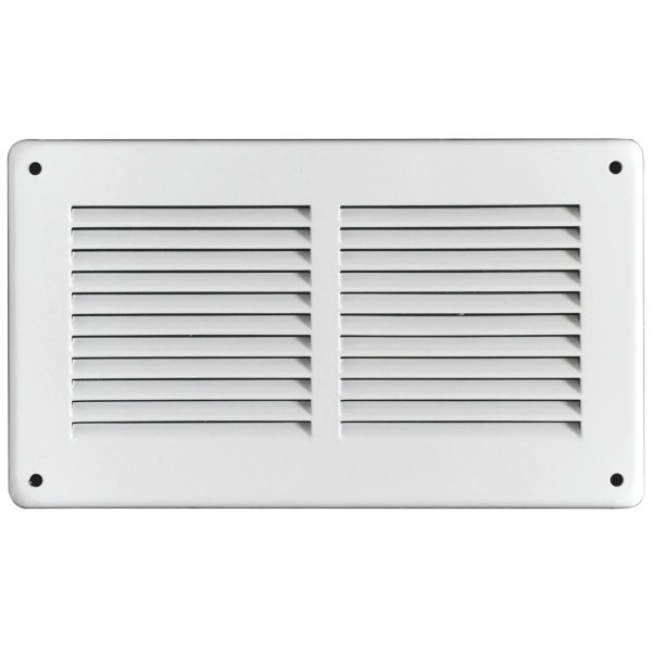 Griglia per aereazione in metallo verniciato bianco (ral 9010) rettangolare 240x140 mm da applicare con viti e tasselli senza rete antinsetti.