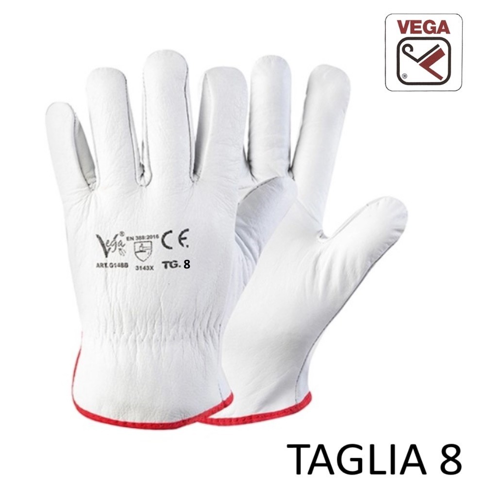 Guanti da lavoro VEGA " art.G148B " Taglia 8 , qualità standard , in pelle fiore bovino di colore bianco CE EN388 (3143) e bordo rosso , forniti al paio con cartoncino appendibili