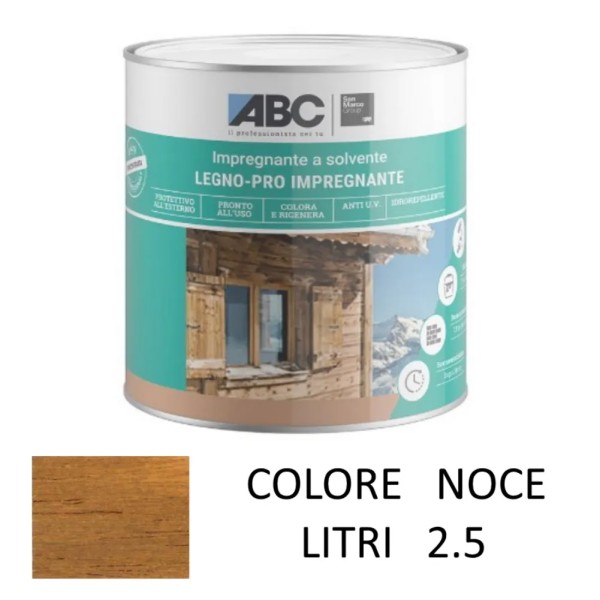 Impregnante ABC colore Noce , indicato per la protezione di legno nuovo o già verniciato , sia all'interno che all'esterno ; Protegge il legno dall'azione aggressiva del sole e degli agenti atmosferici , colora il supporto rendendo il legno idrorepellente .