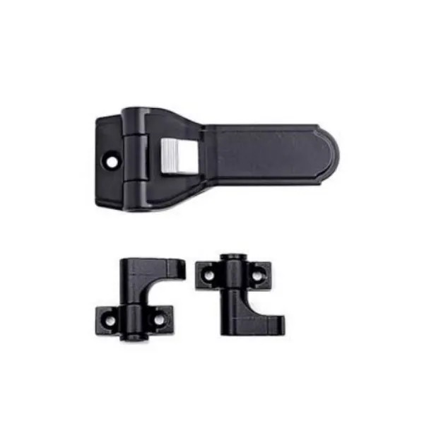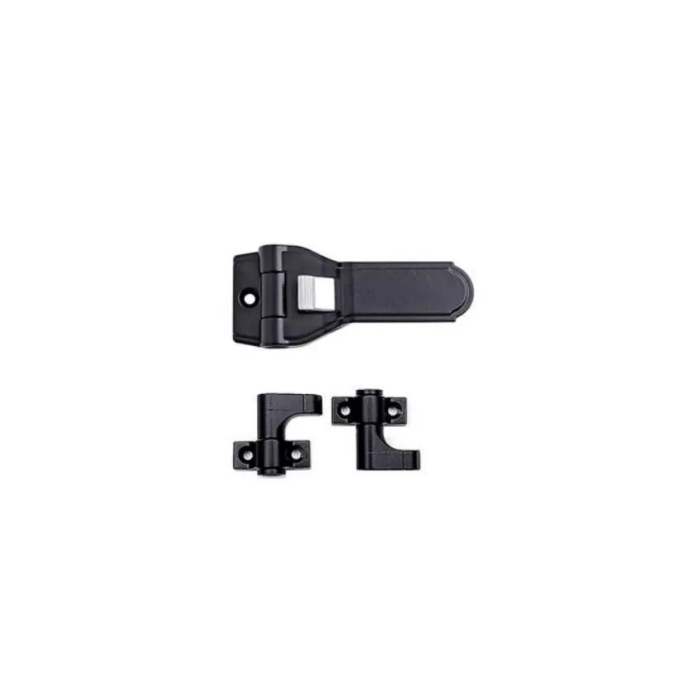 Confezione base per la chiusura della persiana con spagnoletta AGB modello a scatto per 1 anta (impugnatura a scatto con guida asta, fermo per detta, ganci di chiusura dx+sx). Finitura acciaio verniciato nero.