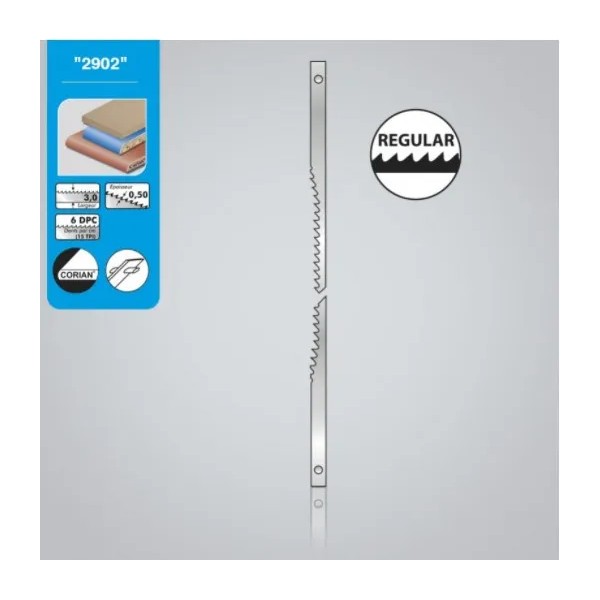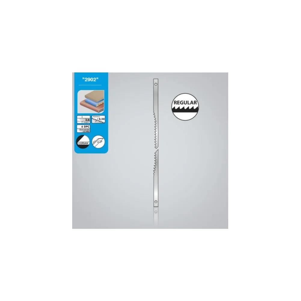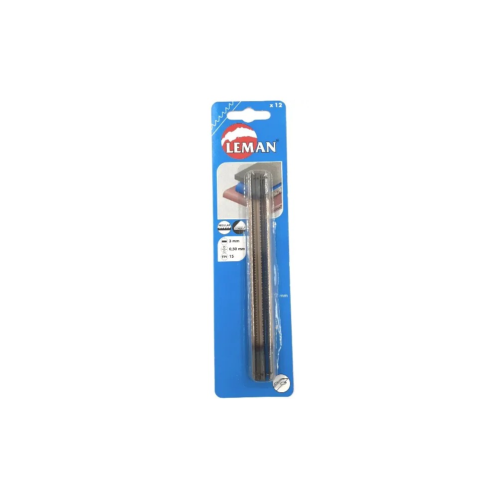 Confezione di 12 lame per traforo elettrico. Lame con perni di interasse : 127 mm Altezza lama : 3 mm Spessore lama : 0,50 mm Numero di denti per pollice : 15 (6 denti per centimetro) Lama adatta al taglio di legno ,stagno,Corian e materie plastiche.