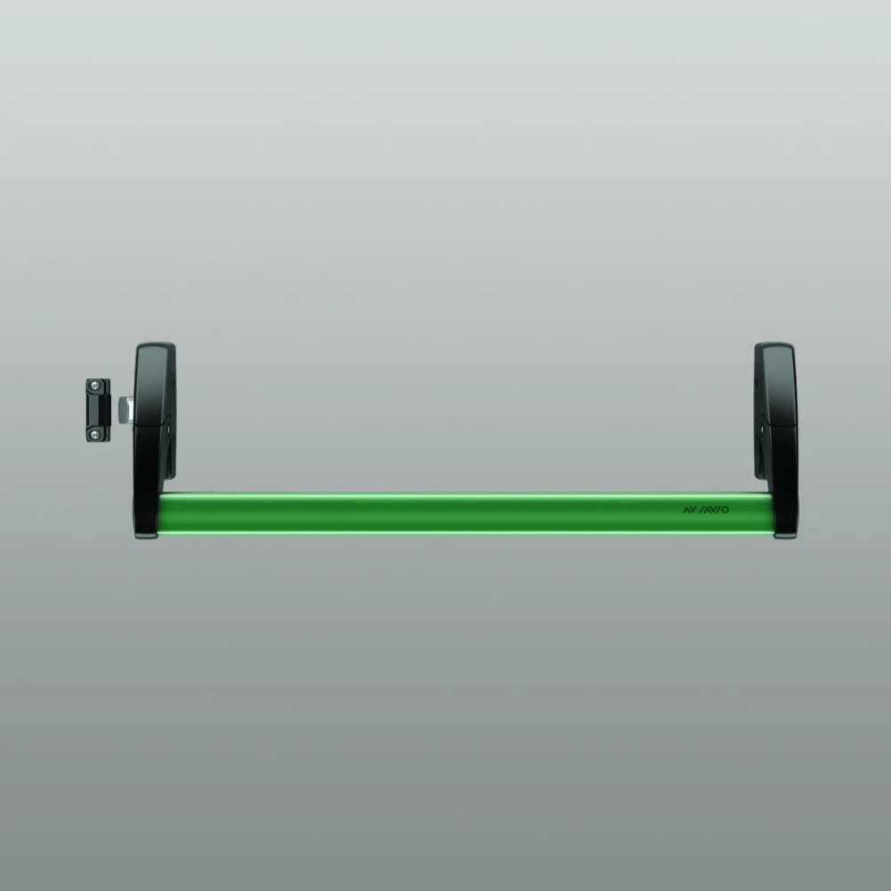 Maniglione antipanico orizzontale ambidestro ad 1 punto di chiusura, versione a leva, in zama e acciaio zincato. Completo di: scrocco in zama nichelata, 1 contropiastra di fissaggio in acciaio zincato e 1 contropiastra di fissaggio in nylon , barra mm 1200 e 2 ferrogliere in zama verniciate, 4 viti TS Ø 4,2x13, 2 viti TC 4,2x13, 2 viti TC 4,8x13, 2 viti TS Ø 4,2x16, 2 viti TS M5x6 e 8 viti TS M4x5 in acciaio zincato. Per porte con un passaggio utile larghezza da 800 a 1240 mm e altezza max 2450 mm.