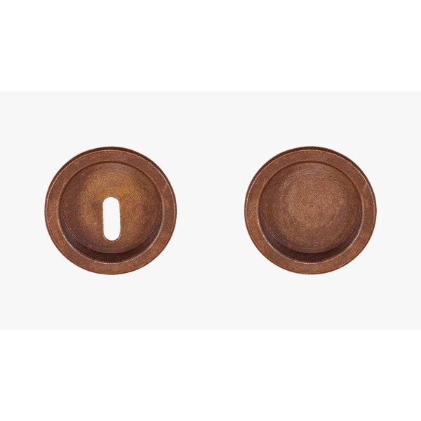 Maniglia ad incasso tonda d.48 mm per scorrevole cieca senza foro chiave. Materiale ferro. Finitura ferro verniciato (ruggine). Dimensione mm.60 esterno. Foro da praticare sull'anta diametro mm.48.