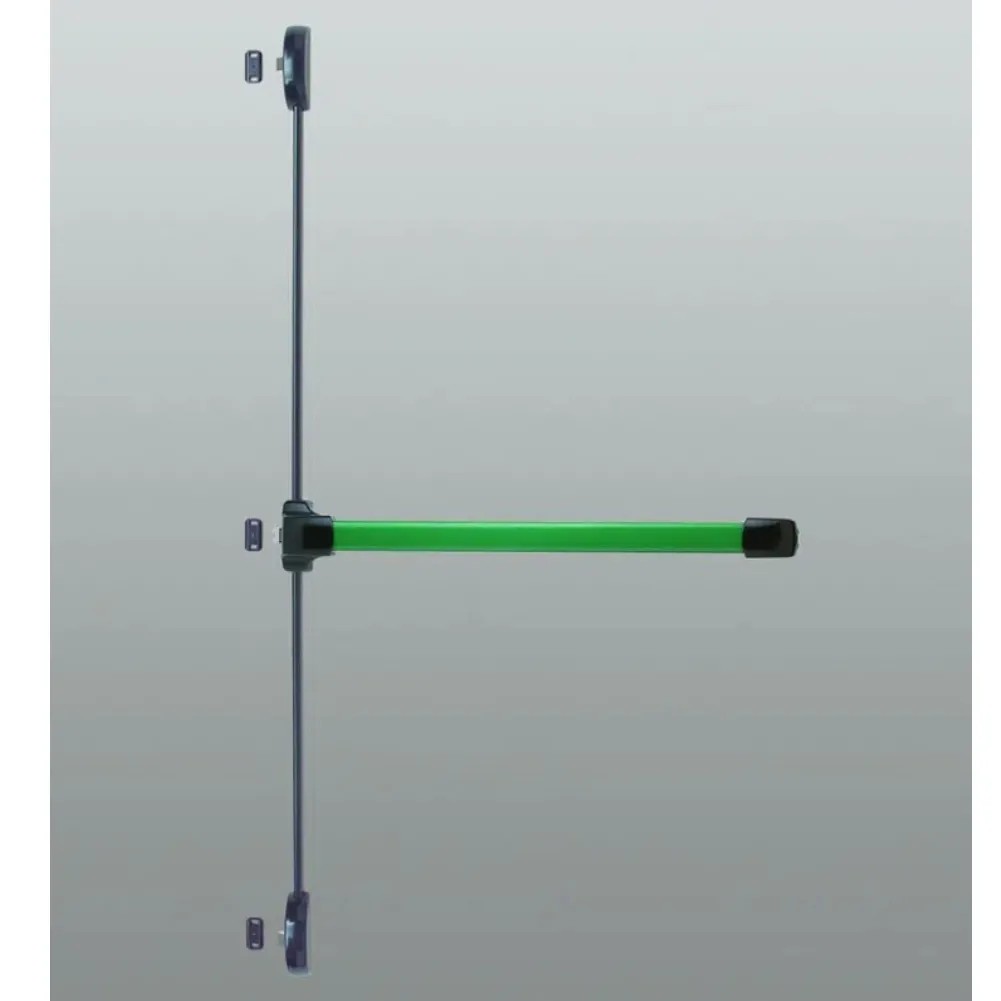 Maniglione antipanico verticale,ambidestro a 3 punti di chiusura,in zama e acciaio zincato. Completo di scrocco in zama nichelata,contropiastre di fissaggio in acciaio zincato,barra mm 1085 in alluminio verniciato verde completa di guarnizione in PVC nera per rifinitura estetica, 1 asta superiore e 1 asta inferiore in alluminio, 1 copertina mm 1395 e 1 copertina mm 1037 in alluminio verniciato, 2 passanti regolabili in zama zincata nera, 3 ferrogliera e 9 spessori in zama verniciata, 10 viti TS d.3.9X13 in acciaio zincato bianco,8 viti TS 4,2x13, 6 viti TC D.4.2X19, 24 viti TS M4X5 e 2 viti TS M4X16 in acciaio zincato nero, 4 grani M6X8 in acciaio zincato bianaco e 1 dima in nylon per il montaggio dei grani. Per porte con passaggio utile larghezza da 800 a 1240 mm.