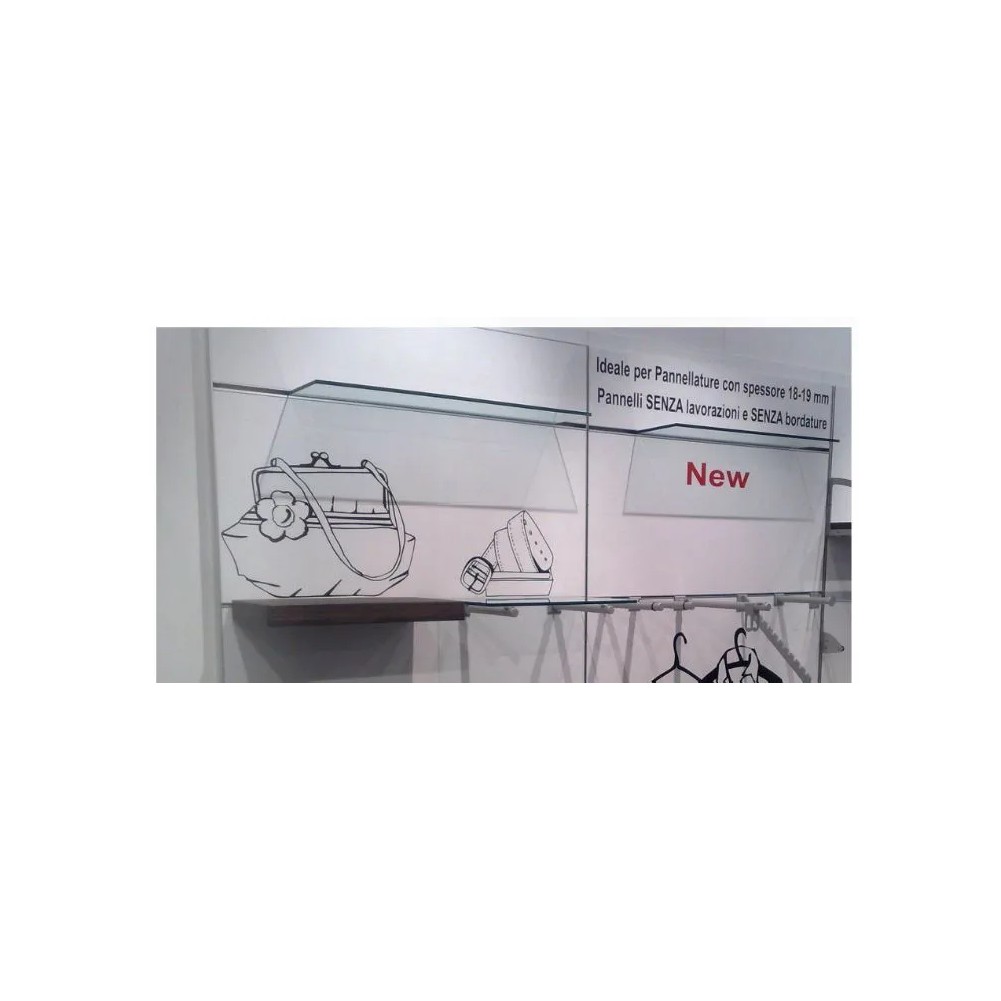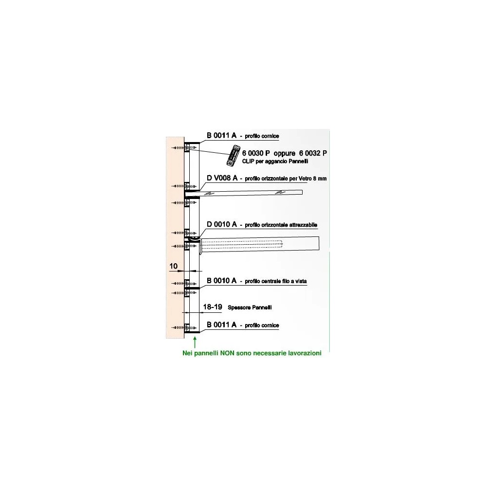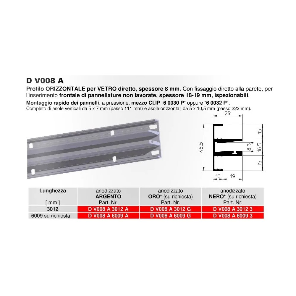 Il profilo D V008A,unico nel suo genere, permette l'inserimento, al suo interno, di piani in vetro da 8 mm. Viene fissato direttamente a parete e i pannelli frontali con spessore da 18/19 mm vengono montati a pressione tramite le clip 6 0030 P o 6 0032 P. Il profilo dovrà essere completato con la guarnizione antiscivolo G DV04 P.