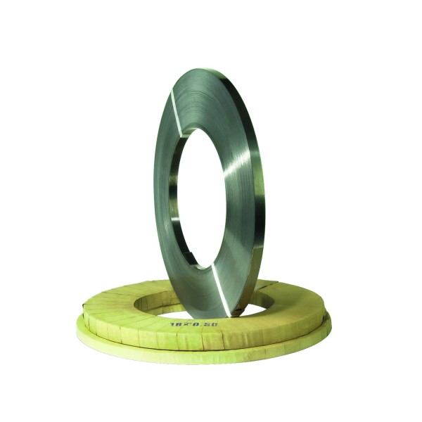 Reggetta in ferro lucida acciaiosa in rotoli incartati, carico di rottura 70-75 kg-mm2, bordi arrotondati, superficie oliata. Dimensione larghezza mm.30 spessore 1.00 mm. peso del collo (1 rotolo) circa kg.36.