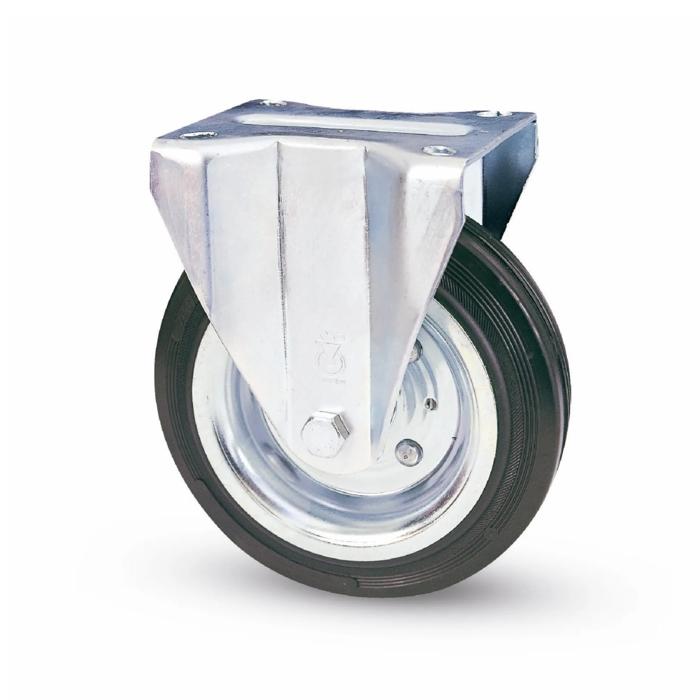 Ruota per uso industriale,supporto tipo medio in acciaio stampato zinco-cromato,piastra fissa mm.100x85. Ruota in gomma piena nera d.80x25 mm,flange in acciaio. Portata kg.50 (dinamica). Altezza mm.108.