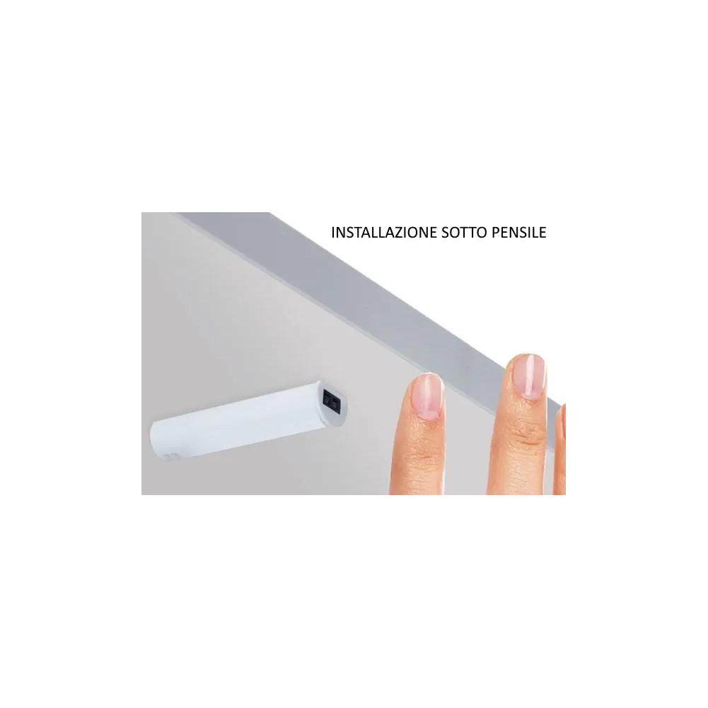 Un rapido movimento permette accensione o spegnimento mentre con l'apparecchio acceso, la presenza costante della mano di fronte al sensore permette la regolazione dell'intensità luminosa.