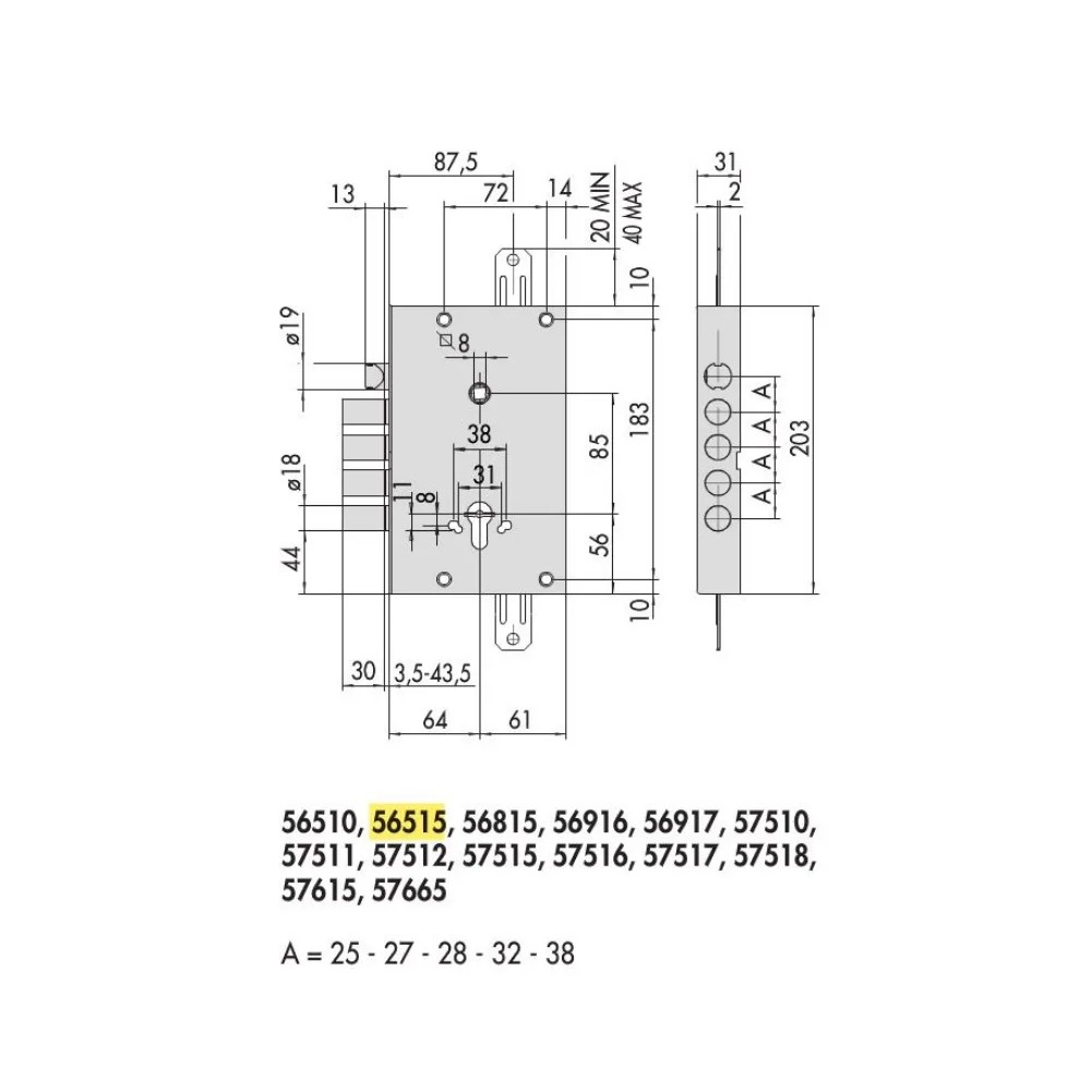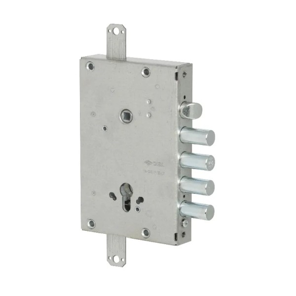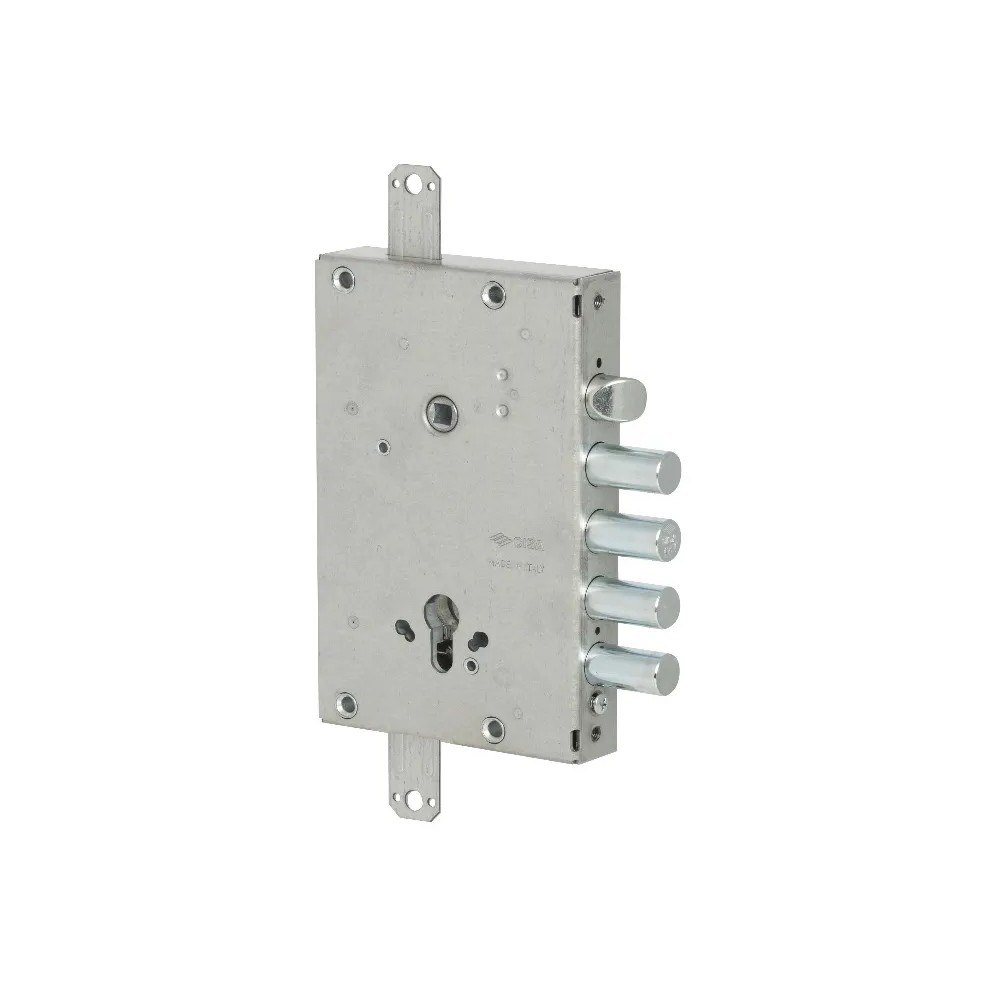 Serratura di sicurezza per porta blindata da applicare con funzionamento ad ingranaggi a cilindro. 4 catenacci in acciaio zincato. Scrocco reversibile zincato alta resistenza. Interasse fra i catenacci mm.28 sporgenza mm.3.5. Entrata mm.64. Predisposta per chiusure supplementari. Versione da applicare.