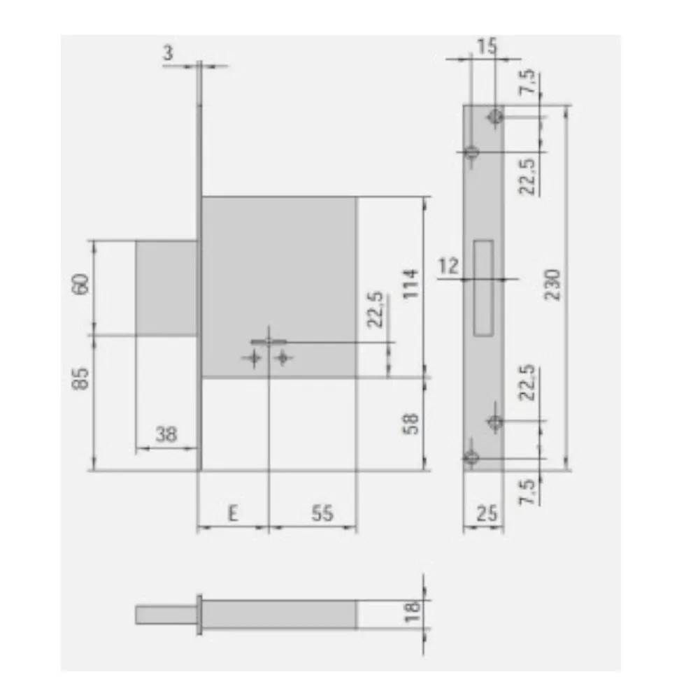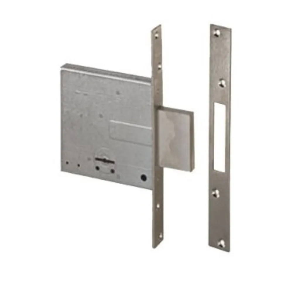 Serratura da infilare a doppia mappa con chiusura laterale. Altezza scatola mm.114 entrata mm.60. Completa di contropiastra.