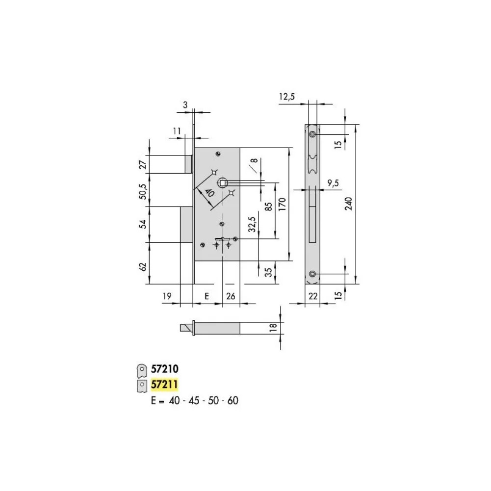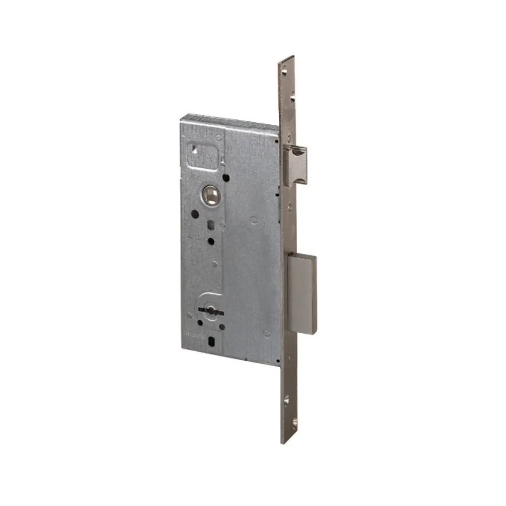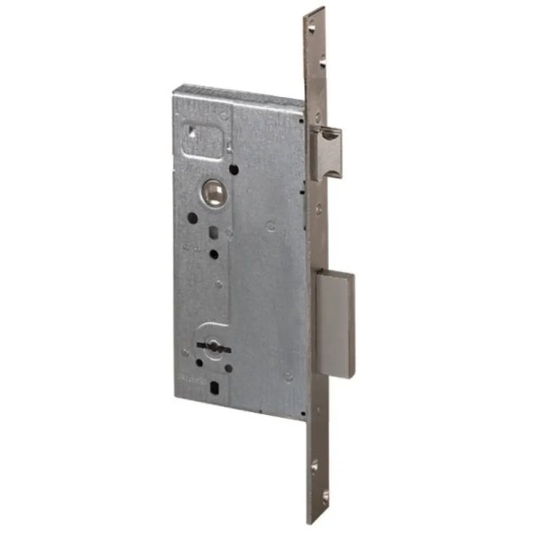 Serratura da infilare a doppia mappa per serramenti in legno con catenaccio e scrocco. Frontale e contropiastra in acciaio nichelato. Scatola in acciaio con rivestimento in zinco, scrocco reversibile piatto ad invito nichelato e catenaccio di chiusura laterale in acciaio, entrate disponibili mm.40-50-60. Contropiastra inclusa.