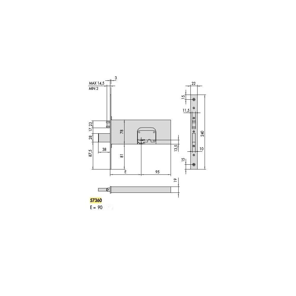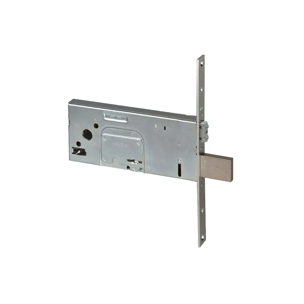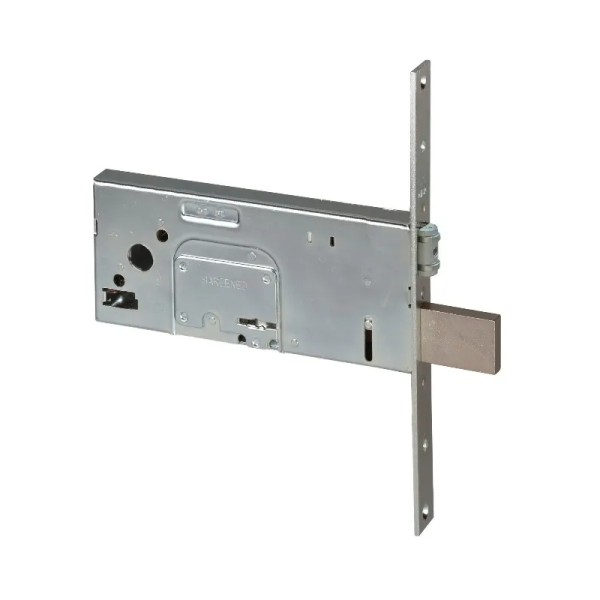 Serratura da infilare a doppia mappa per fasce. Altezza scatola mm.78, entrata mm.90. Catenaccio e rullo.