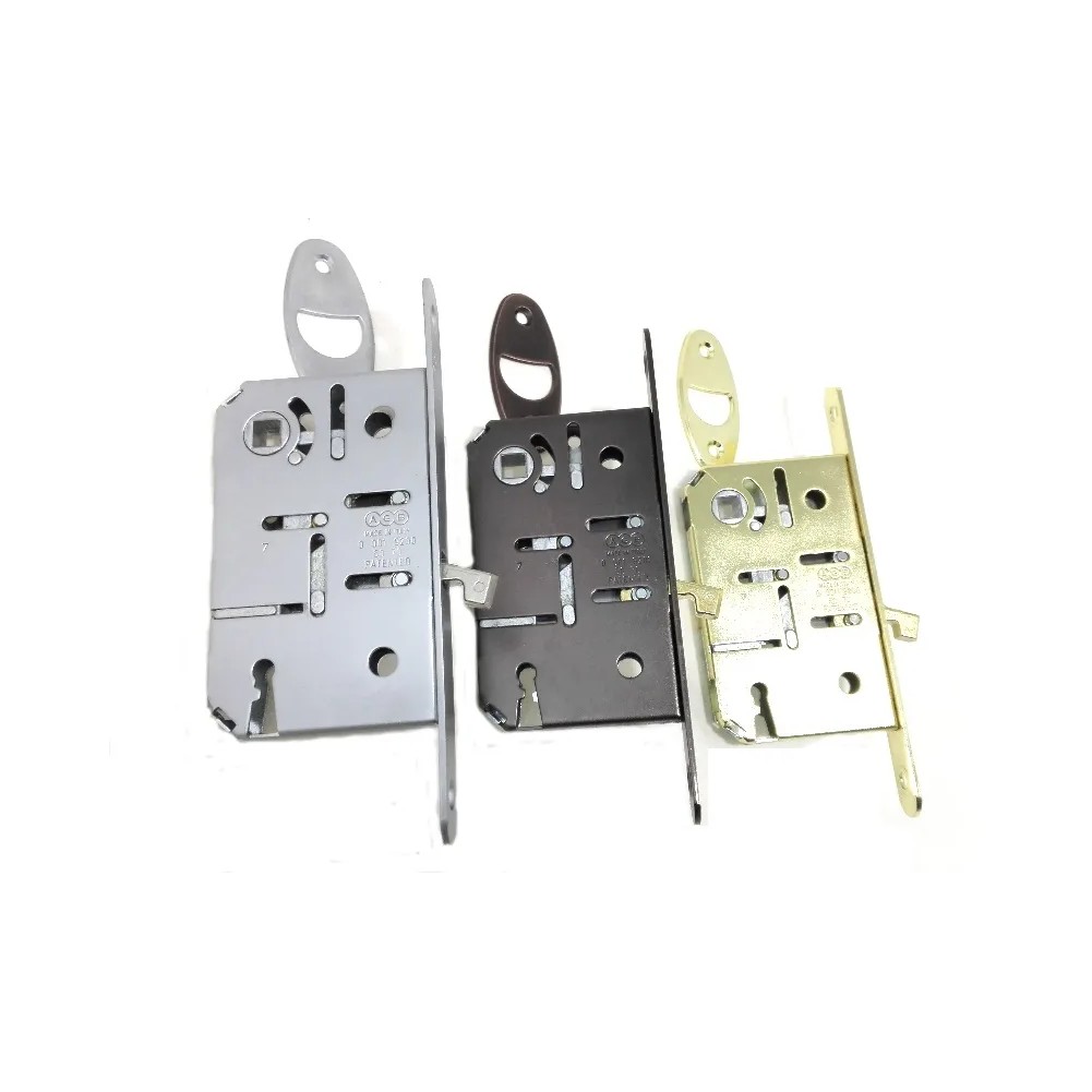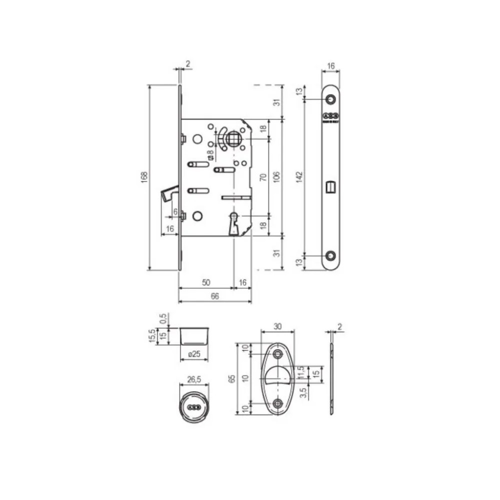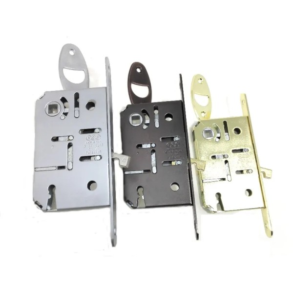 Serratura per porta scorrevole Scivola T, versione con catenaccio a gancio rientrante mediante quadro maniglia mm.8 e chiave per il bloccaggio, frontale a bordo tondo 16x168 mm. Disponibile con entrata mm.50. Finitura ottonato verniciato, bronzato, cromato opaco.