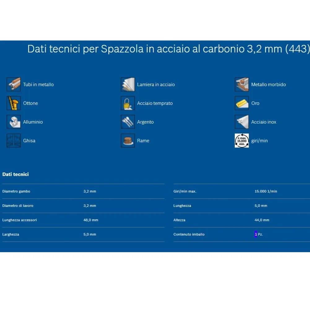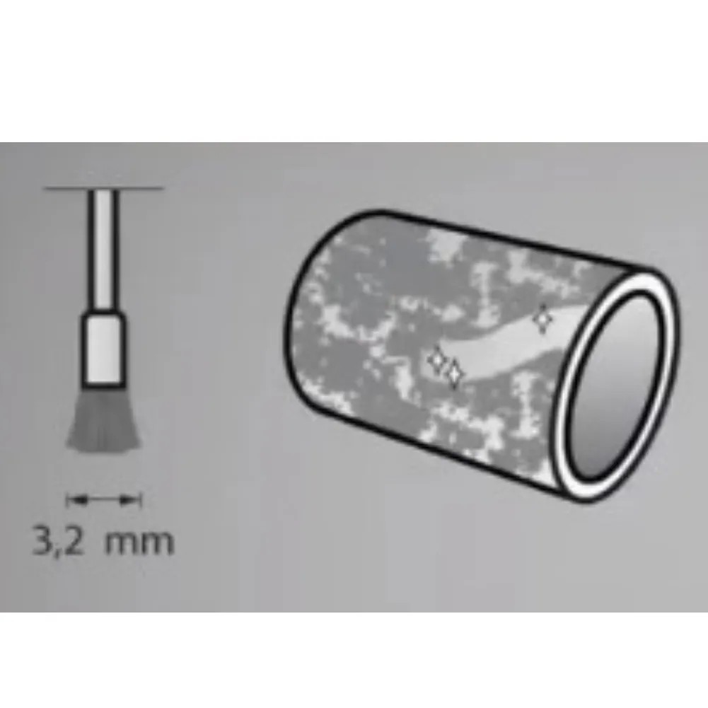 Spazzola DREMEL in Acciaio al Carbonio , di diametro 3.2 mm , utilizzata per rimuovere la Ruggine e corrosione , per Lucidare superfici metalliche , per sbavature e per lisciare punti di giunzione di superfici o per pulire componenti elettrici ; utilizzate anche per l'Alluminio e l'Acciaio Inox
