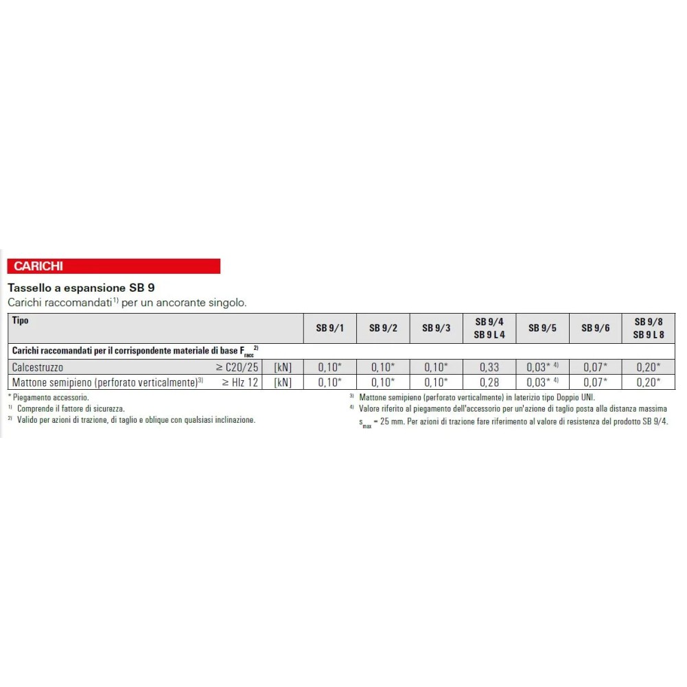Le alette anti-rotazione impediscono al tassello di ruotare all'interno del foro durante l'installazione.Il tassello SB può essere usato su :Calcestruzzo,Mattone pieno,Mattoni forati,Pietra compatta. Su supporti forati, forare solo a rotazione,non a rotopercussione.